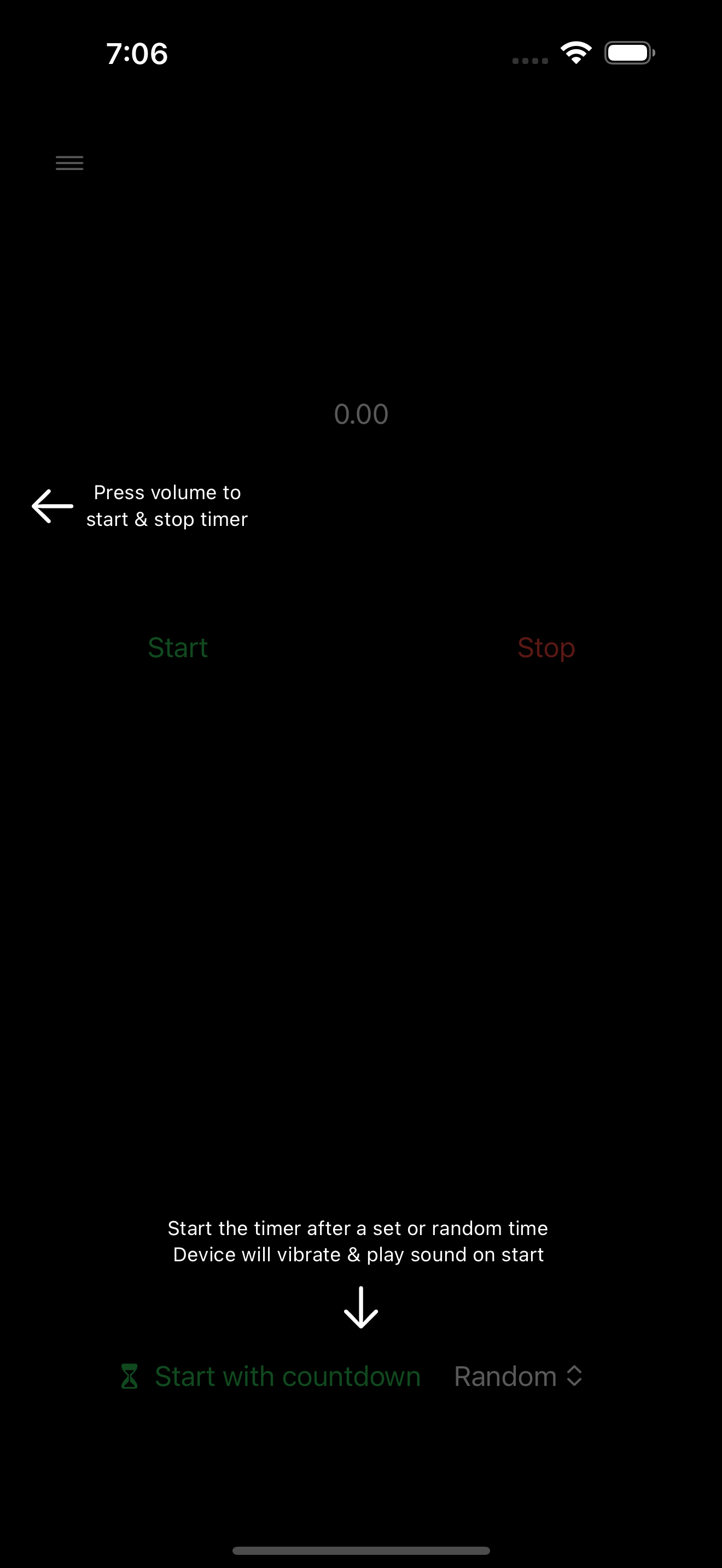 To start the timer, simply press either volume button. To stop it, press either button again. Remove the inaccuracies of self-timing short distance sprints. Additionally, set the timer to begin on a random countdown and buzz/alert on start of the timer, simulating a race on meet day.